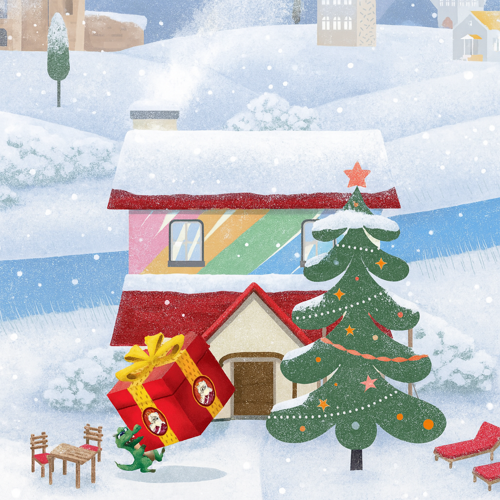 Kiko weet niet waar eerst te kijken. Rekken staan vol met glinsterende kerstballen, kleurrijke slingers, magische elfjes en gezellige sfeerverlichting. Mensen of dieren die hun huis willen versieren, kunnen hier langskomen. Tuur zet een grote mand op een houten slee. ‘Kies maar wat je wilt!’ Kiko kan zijn ogen niet geloven. Wat word ik verwend! Dit is precies wat ik zoek op dit moment. Zijn ogen glinsteren nog mooier dan de sfeerverlichting bij Tuur. Hij geeft Tuur een dikke knuffel en keert terug met een slee vol kerstballen, magische elfjes, kerstverlichting en slingers voor in de reusachtige dennenboom bij het regenbooghuis.